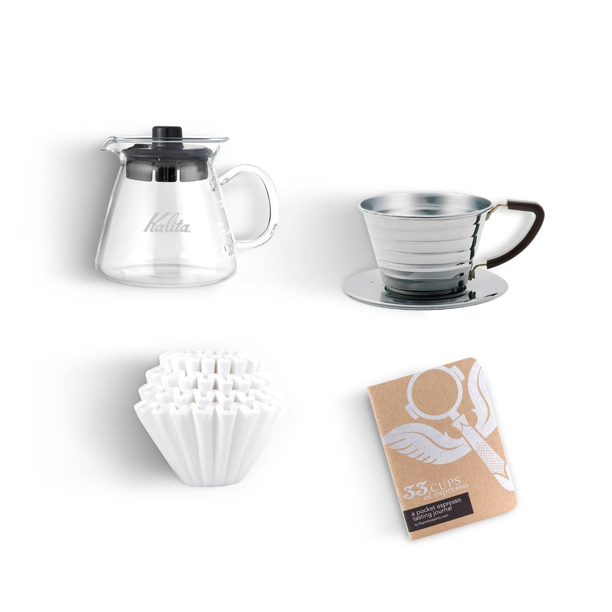 This coffee brewing kit is for experts or beginners. It contains our best-selling pour-over brewer; the stainless steel 155 Wave and Wave Filters. As an added bonus this brew bundle includes a coffee journal so you can easily record your favorite roast notes and refer to them when it’s time to restock your coffee bean levels.